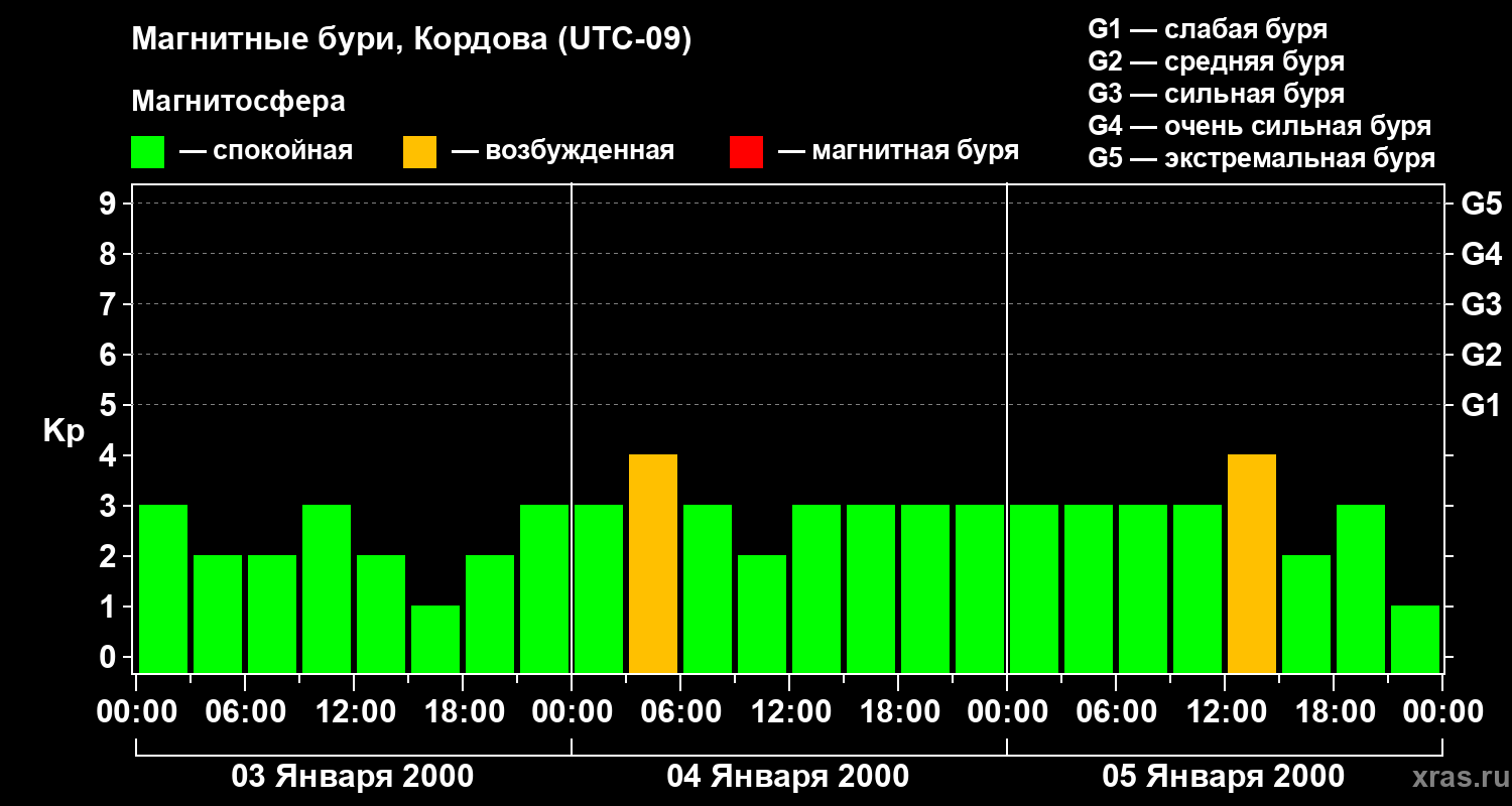 Изменения геомагнитного индекса Kp с 3 по 5 января 2000 года для средних широт