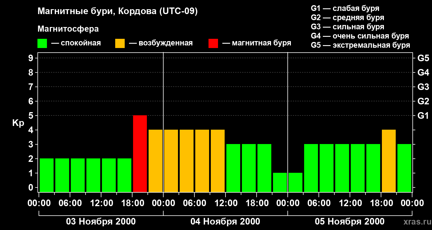 Изменения геомагнитного индекса Kp с 3 по 5 ноября 2000 года для средних широт