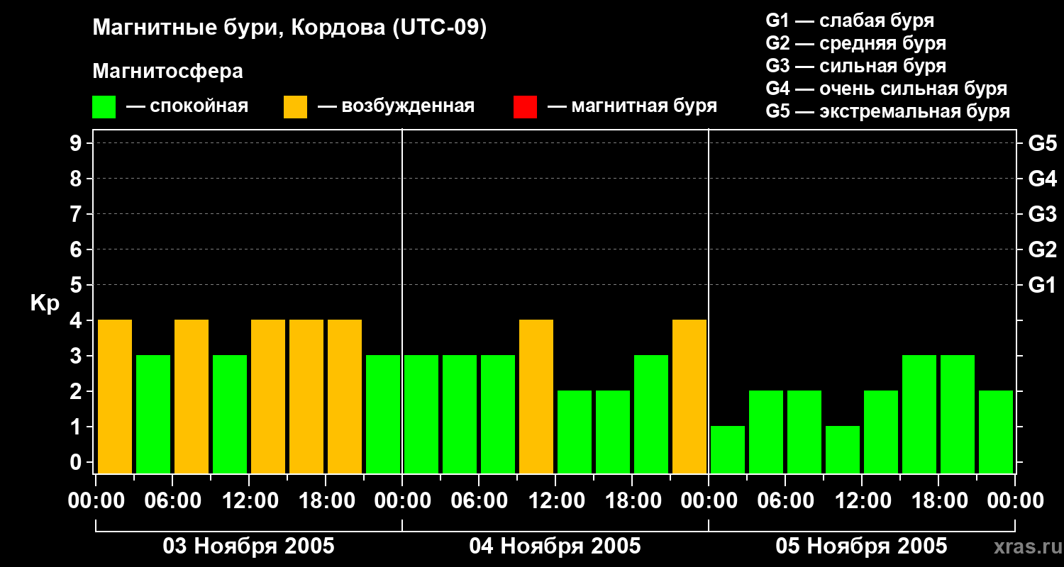 Изменения геомагнитного индекса Kp с 3 по 5 ноября 2005 года для средних широт