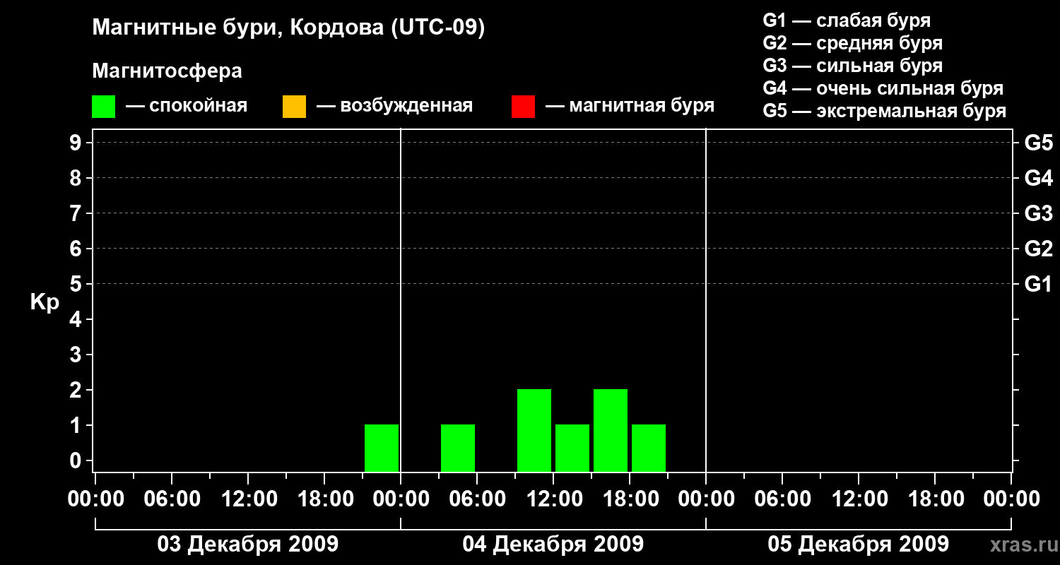 Изменения геомагнитного индекса Kp с 3 по 5 декабря 2009 года для средних широт