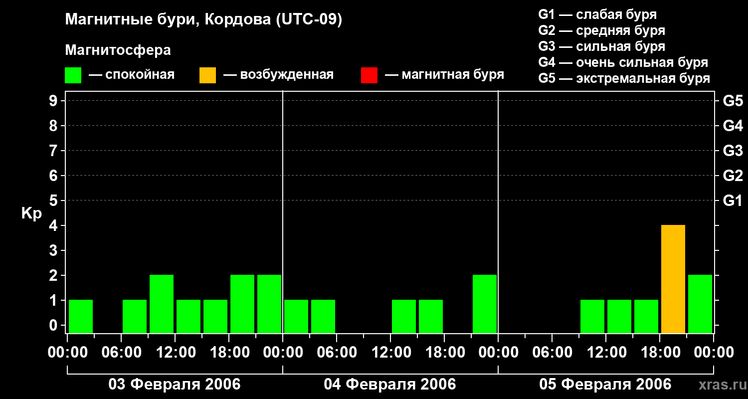 Изменения геомагнитного индекса Kp с 3 по 5 февраля 2006 года для средних широт