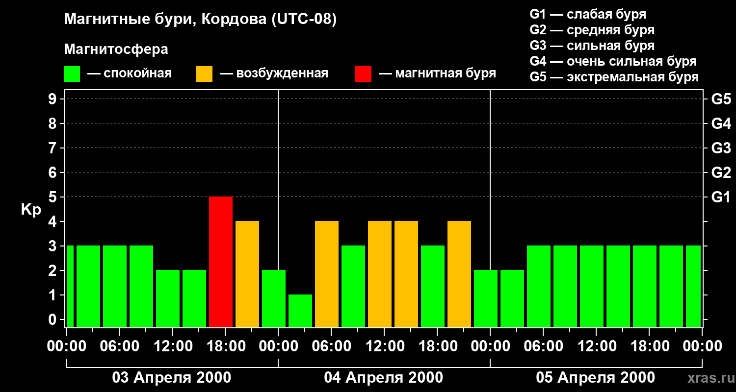 Изменения геомагнитного индекса Kp с 3 по 5 апреля 2000 года для средних широт