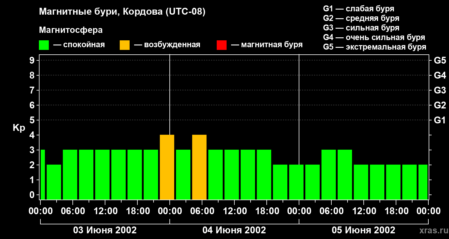 Изменения геомагнитного индекса Kp с 3 по 5 июня 2002 года для средних широт