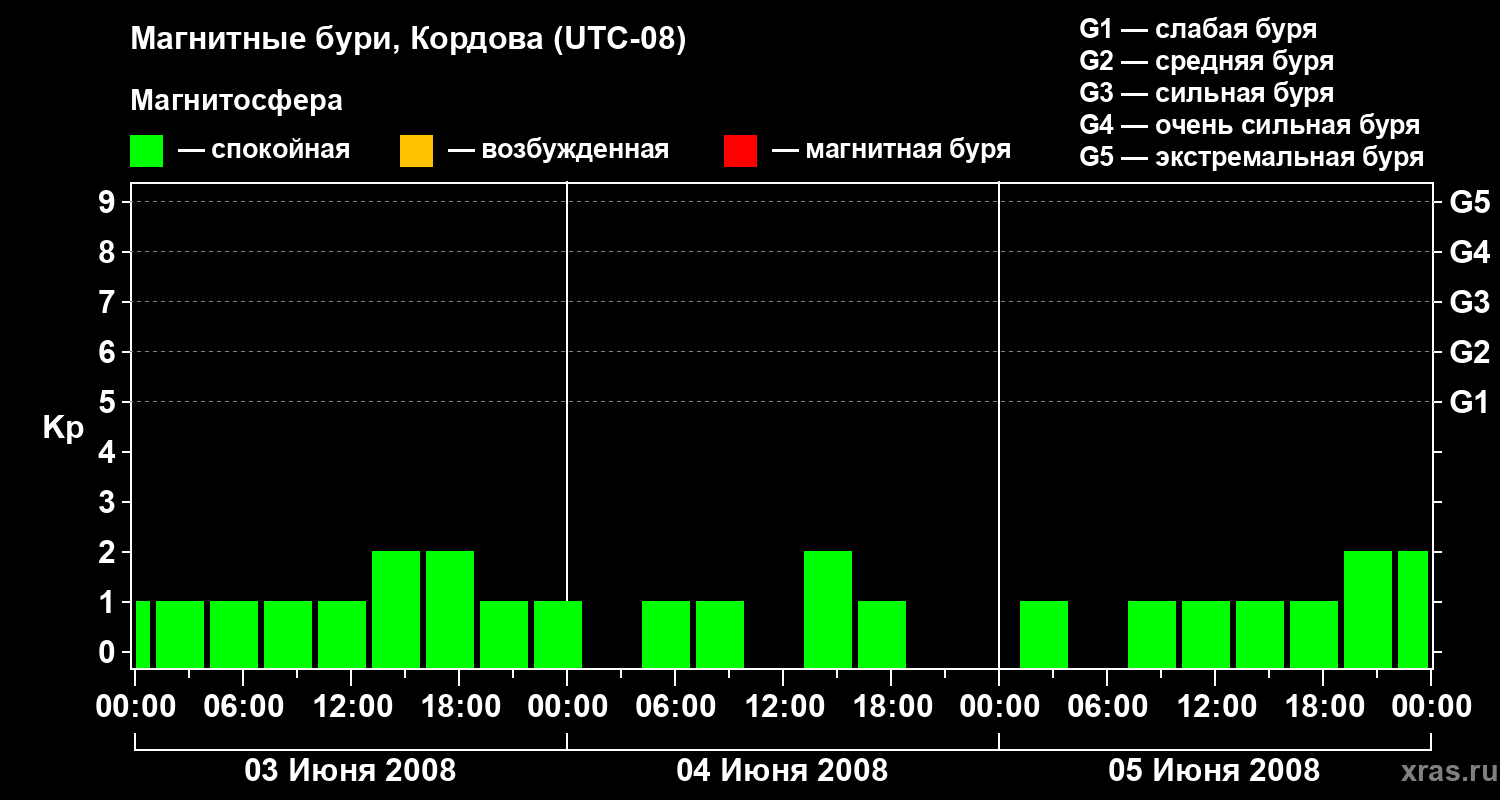Изменения геомагнитного индекса Kp с 3 по 5 июня 2008 года для средних широт