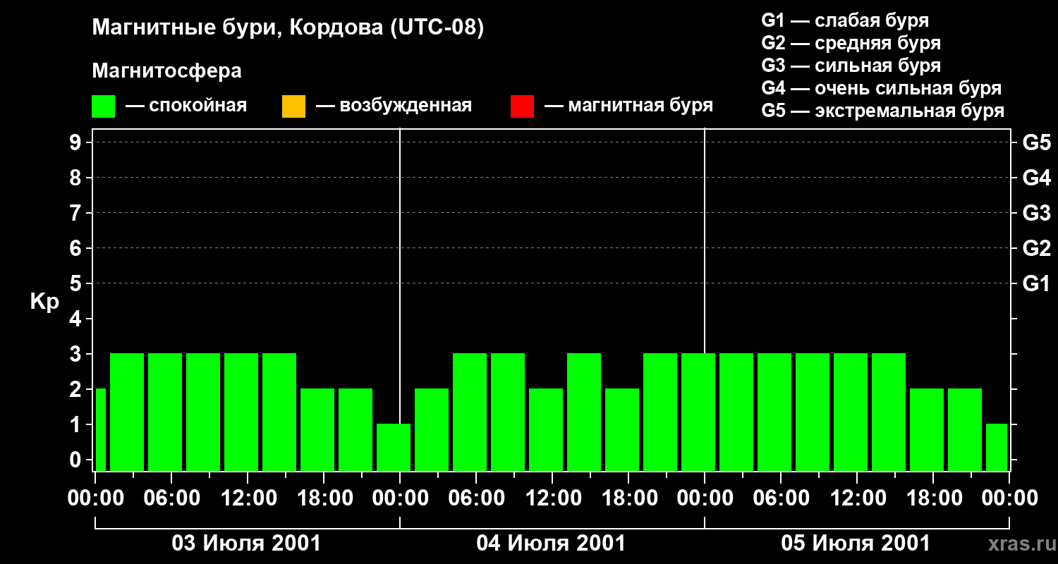 Изменения геомагнитного индекса Kp с 3 по 5 июля 2001 года для средних широт