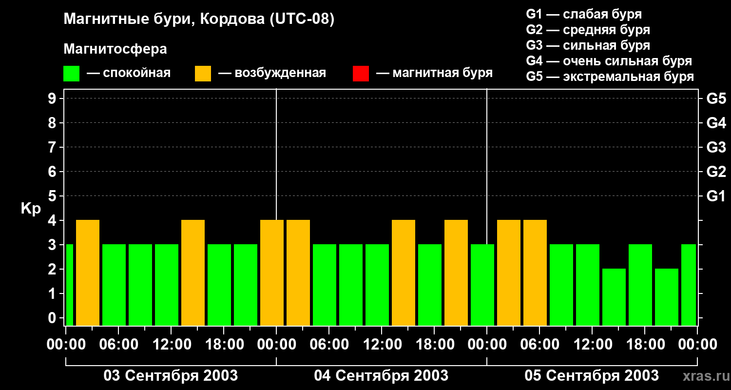 Изменения геомагнитного индекса Kp с 3 по 5 сентября 2003 года для средних широт