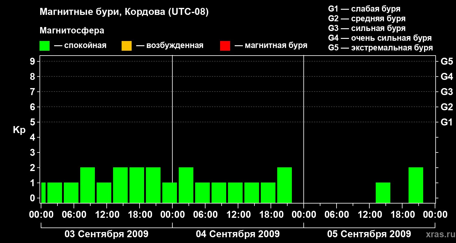 Изменения геомагнитного индекса Kp с 3 по 5 сентября 2009 года для средних широт