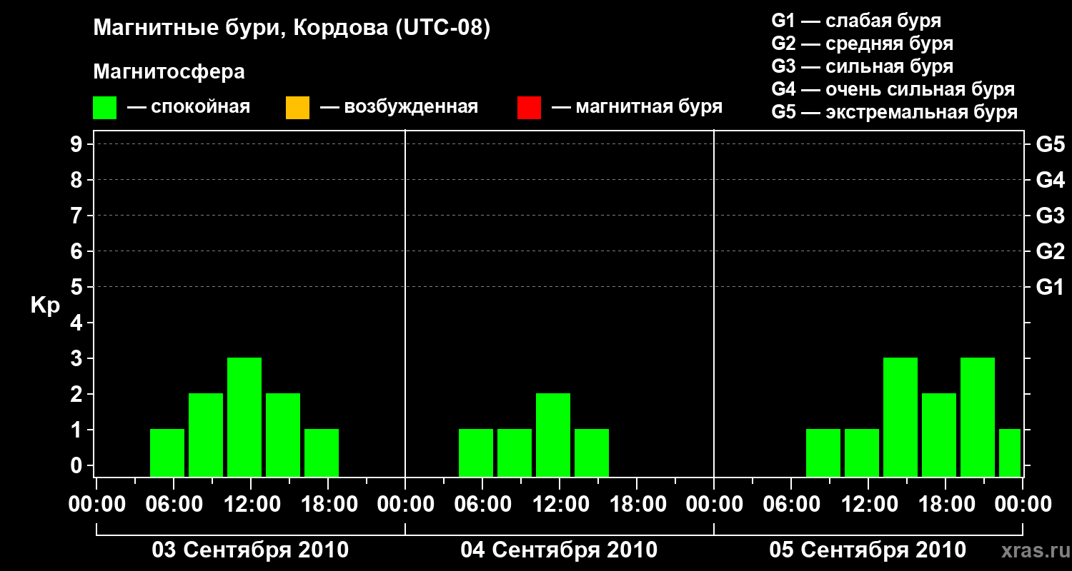 Изменения геомагнитного индекса Kp с 3 по 5 сентября 2010 года для средних широт