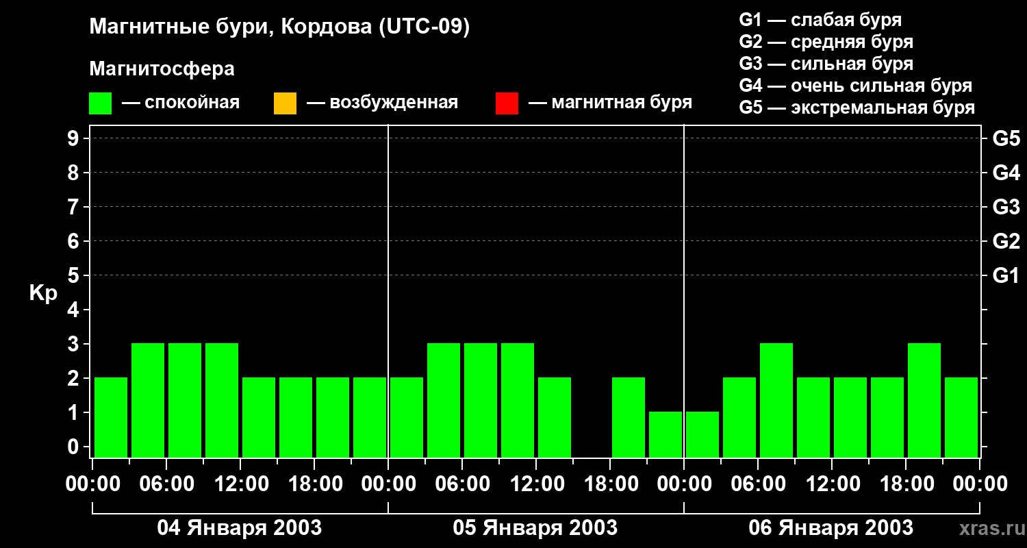 Изменения геомагнитного индекса Kp с 4 по 6 января 2003 года для средних широт
