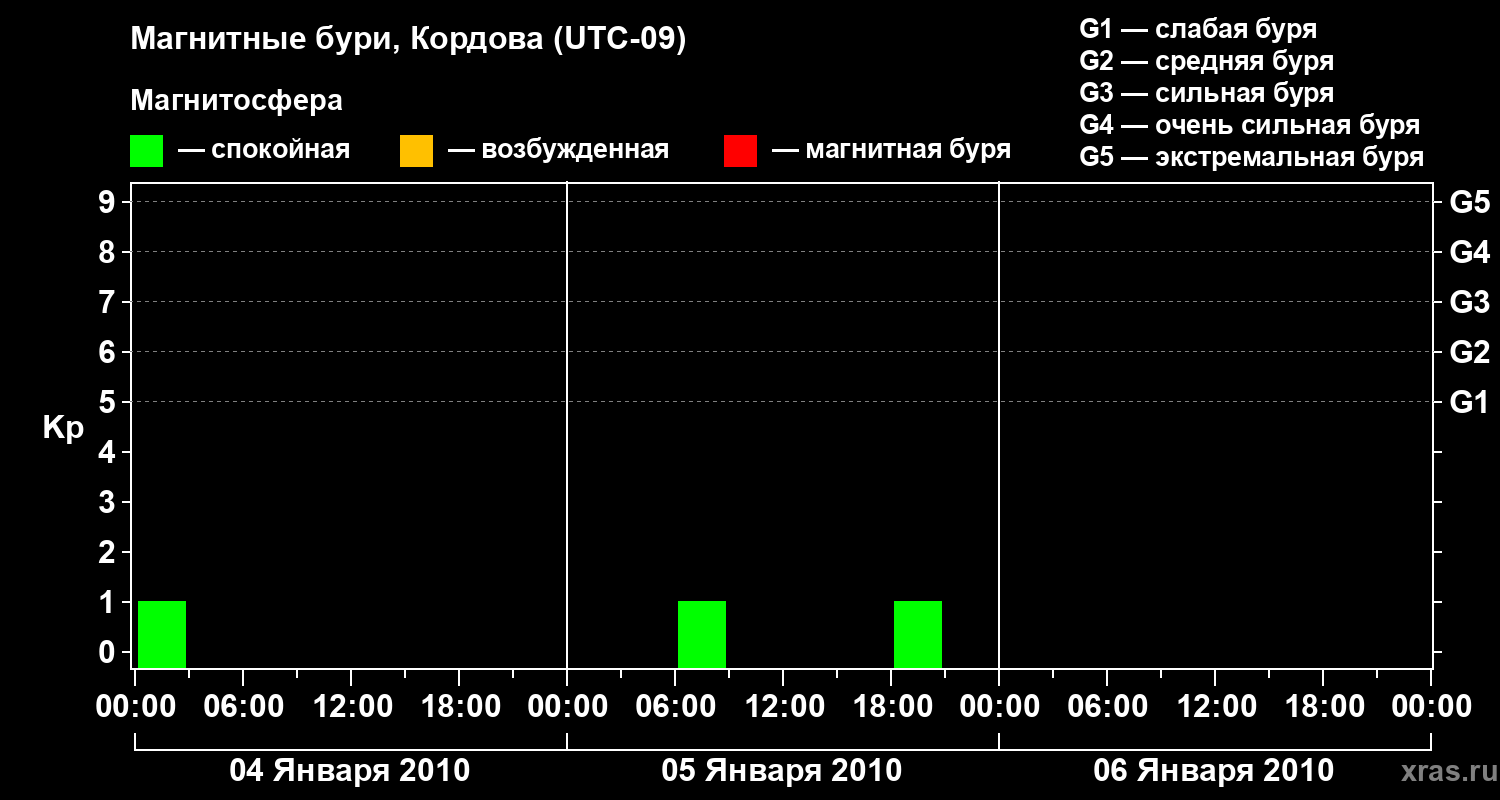 Изменения геомагнитного индекса Kp с 4 по 6 января 2010 года для средних широт