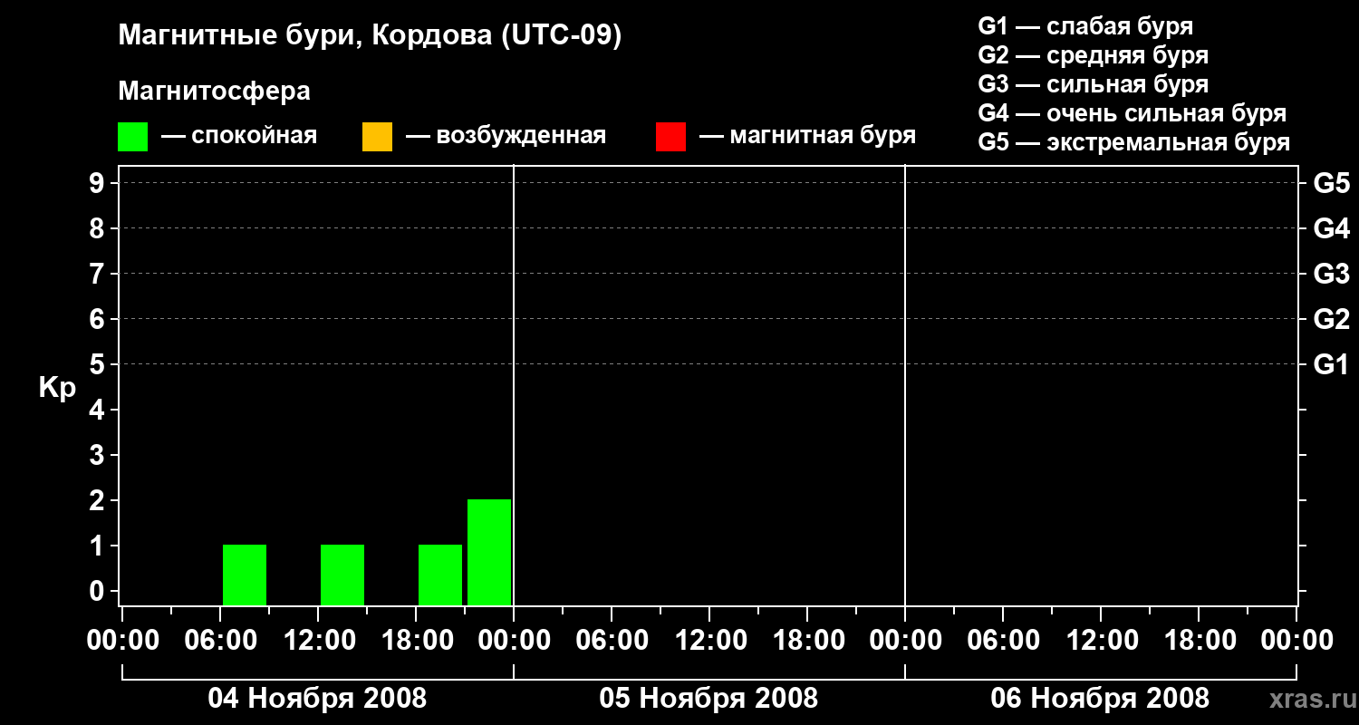 Изменения геомагнитного индекса Kp с 4 по 6 ноября 2008 года для средних широт