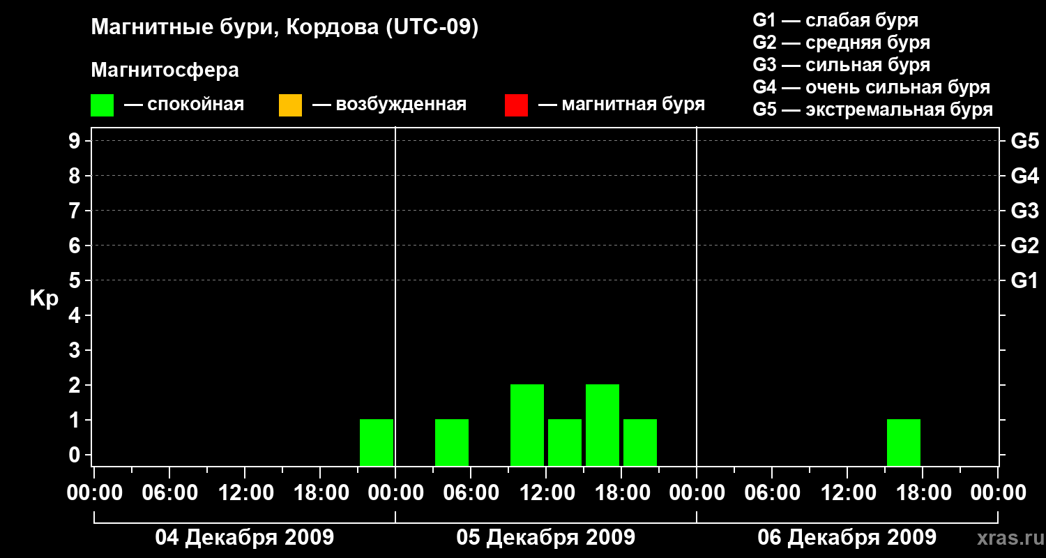 Изменения геомагнитного индекса Kp с 4 по 6 декабря 2009 года для средних широт