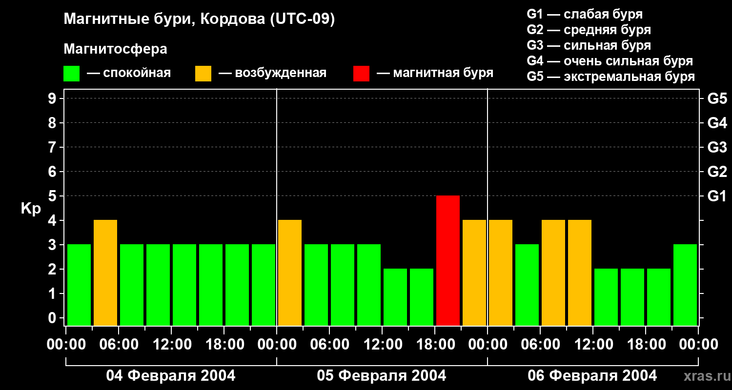 Изменения геомагнитного индекса Kp с 4 по 6 февраля 2004 года для средних широт
