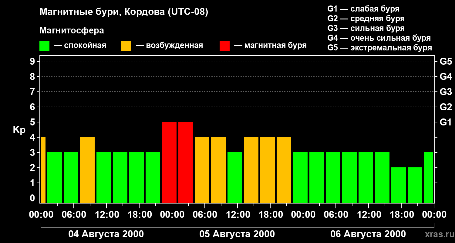 Изменения геомагнитного индекса Kp с 4 по 6 августа 2000 года для средних широт