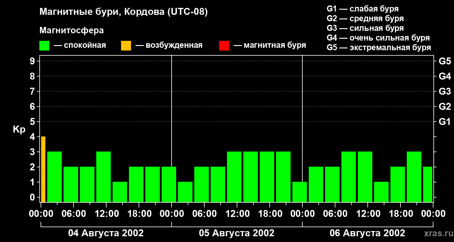 Изменения геомагнитного индекса Kp с 4 по 6 августа 2002 года для средних широт