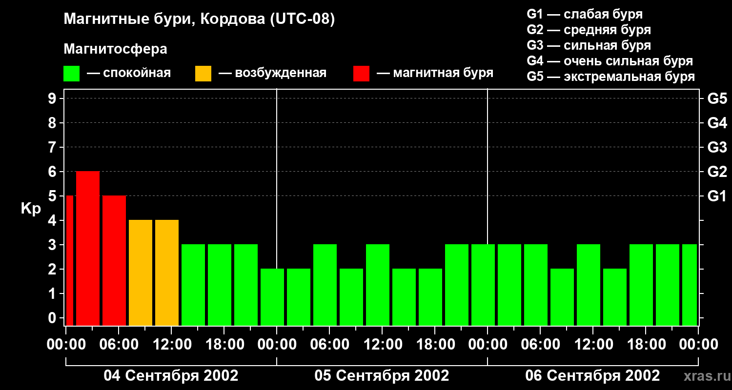 Изменения геомагнитного индекса Kp с 4 по 6 сентября 2002 года для средних широт