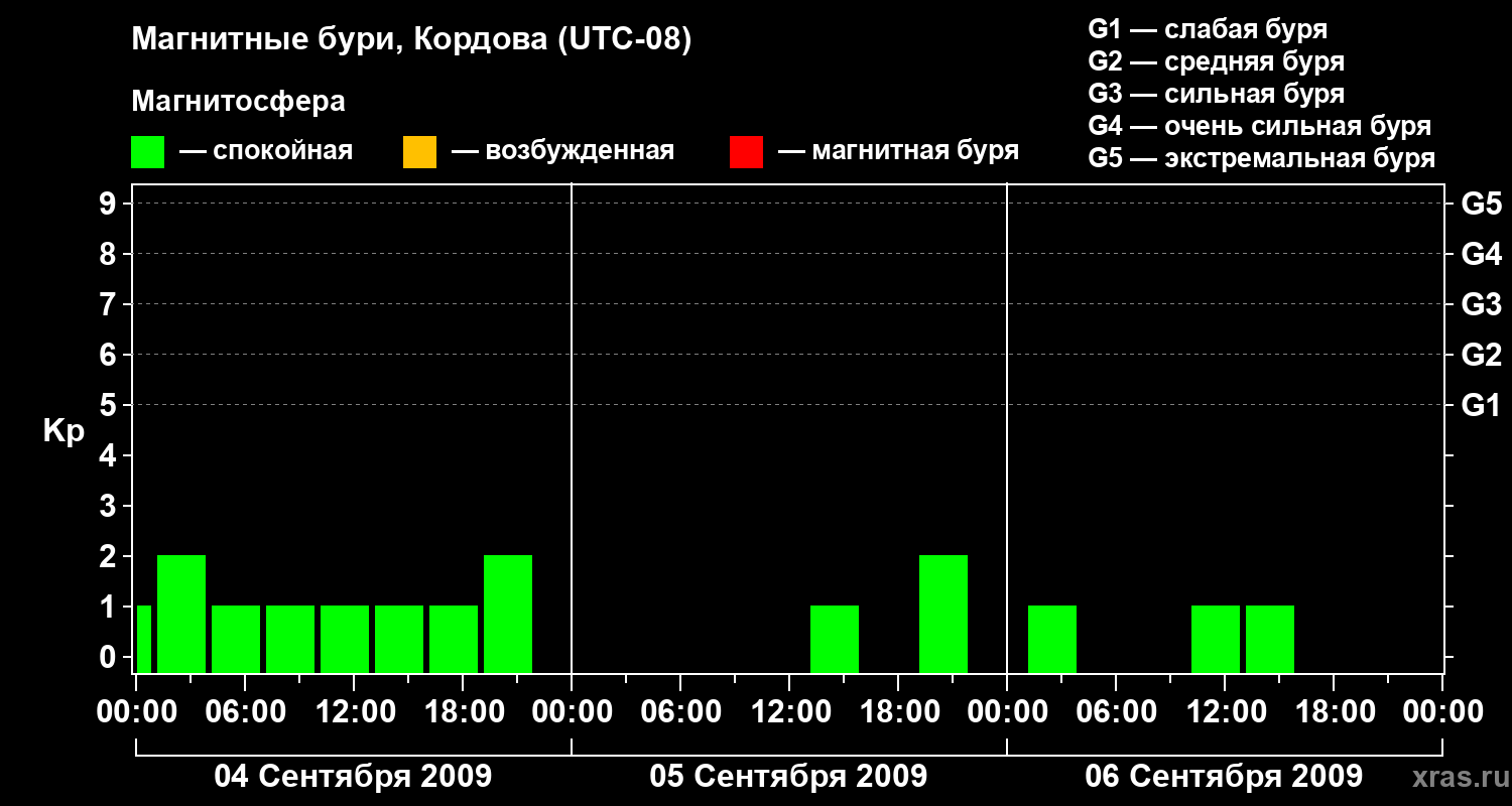 Изменения геомагнитного индекса Kp с 4 по 6 сентября 2009 года для средних широт