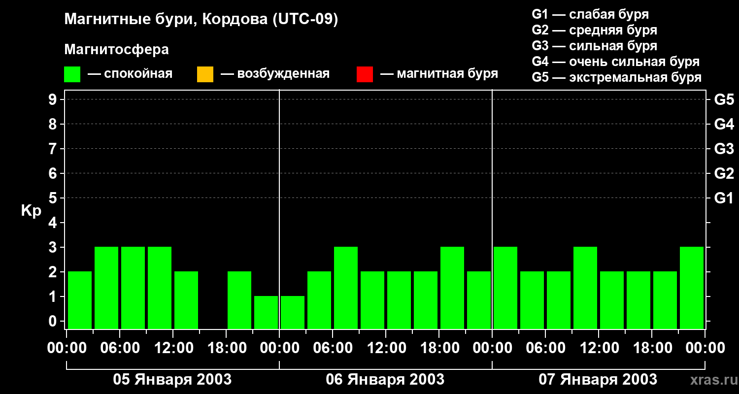 Изменения геомагнитного индекса Kp с 5 по 7 января 2003 года для средних широт