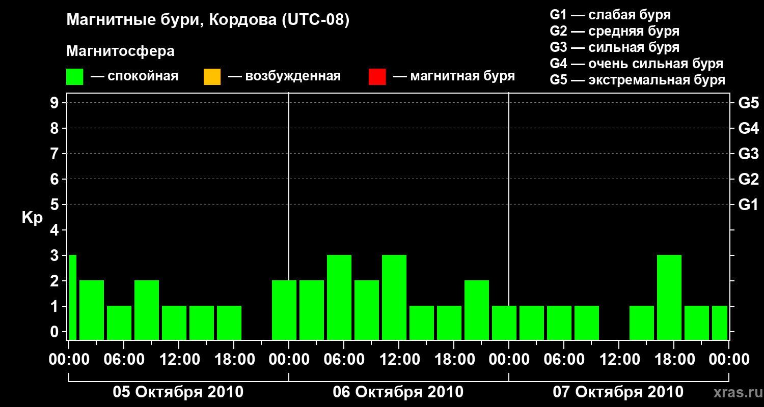 Изменения геомагнитного индекса Kp с 5 по 7 октября 2010 года для средних широт