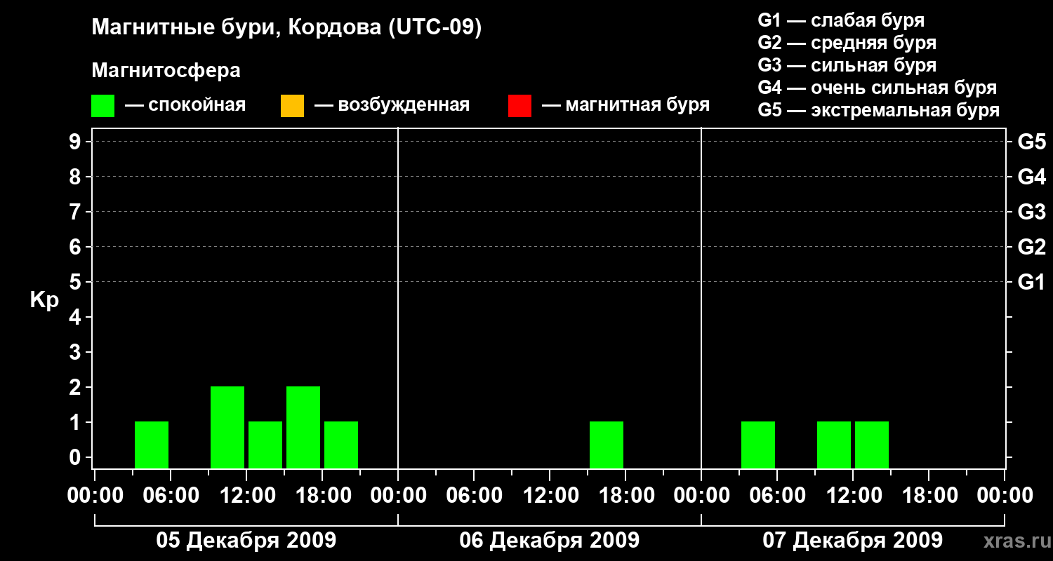 Изменения геомагнитного индекса Kp с 5 по 7 декабря 2009 года для средних широт