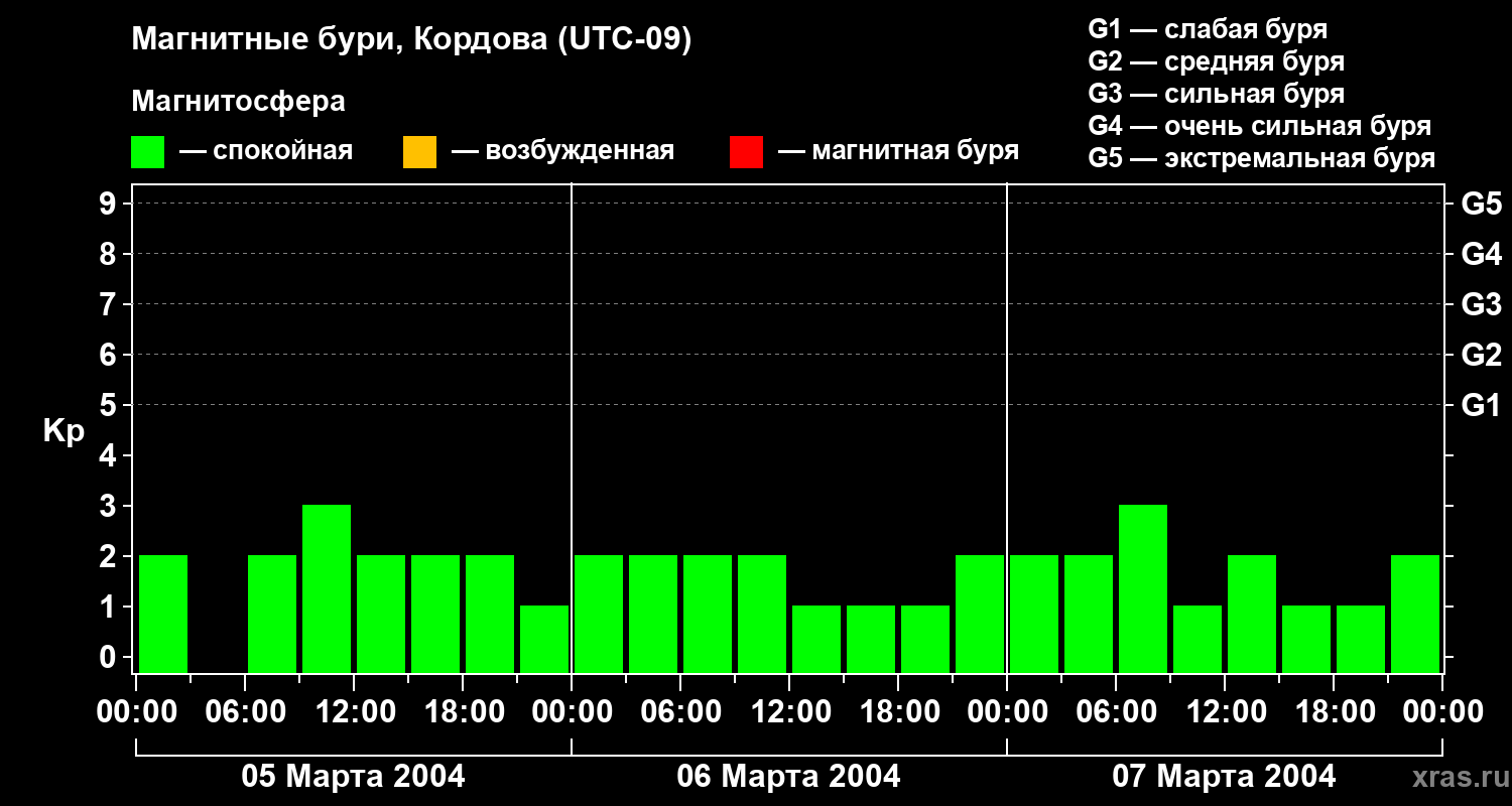 Изменения геомагнитного индекса Kp с 5 по 7 марта 2004 года для средних широт