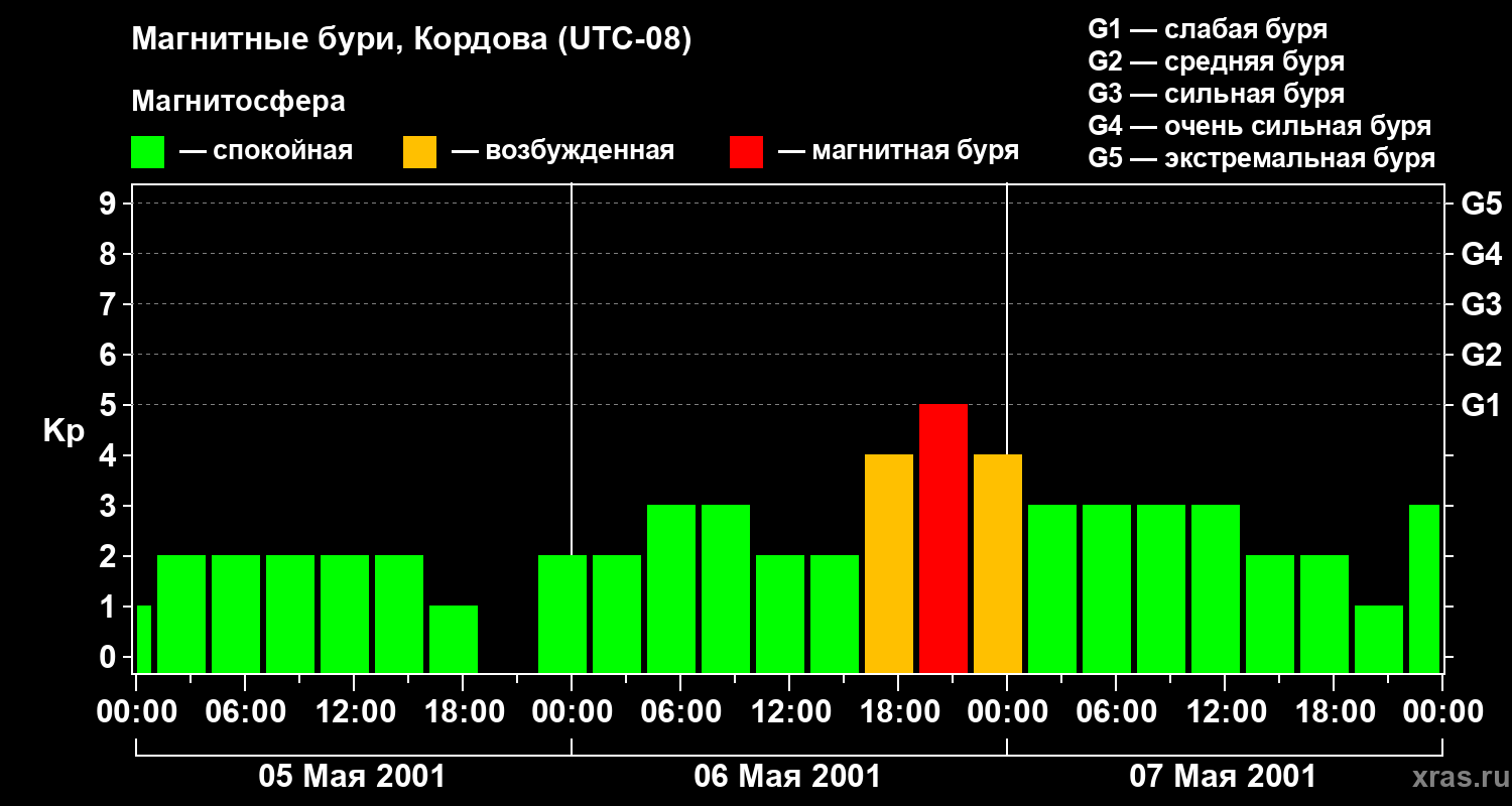 Изменения геомагнитного индекса Kp с 5 по 7 мая 2001 года для средних широт