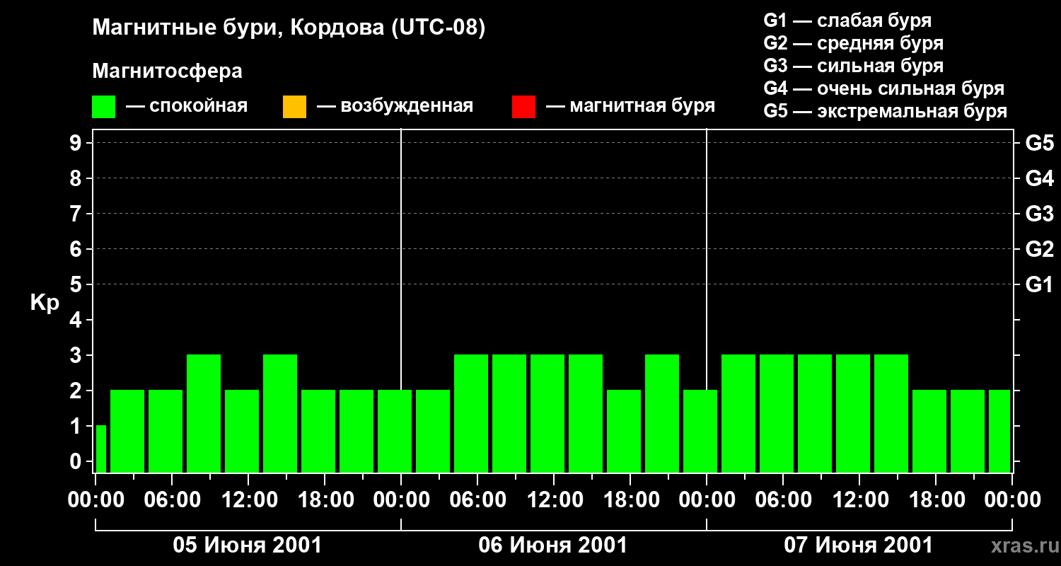 Изменения геомагнитного индекса Kp с 5 по 7 июня 2001 года для средних широт