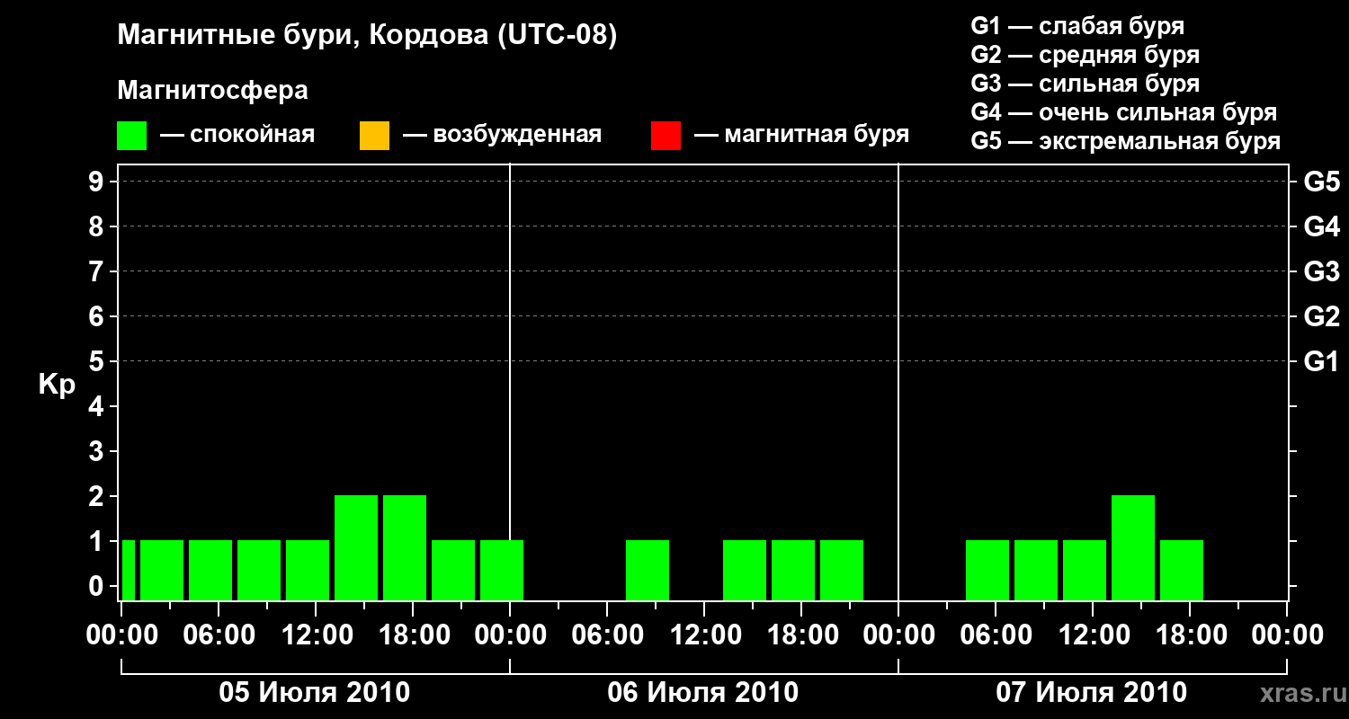 Изменения геомагнитного индекса Kp с 5 по 7 июля 2010 года для средних широт