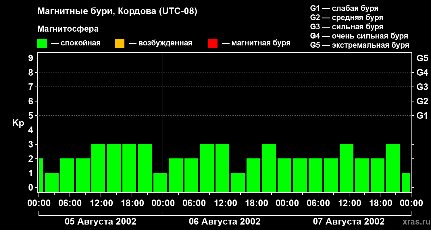 Изменения геомагнитного индекса Kp с 5 по 7 августа 2002 года для средних широт
