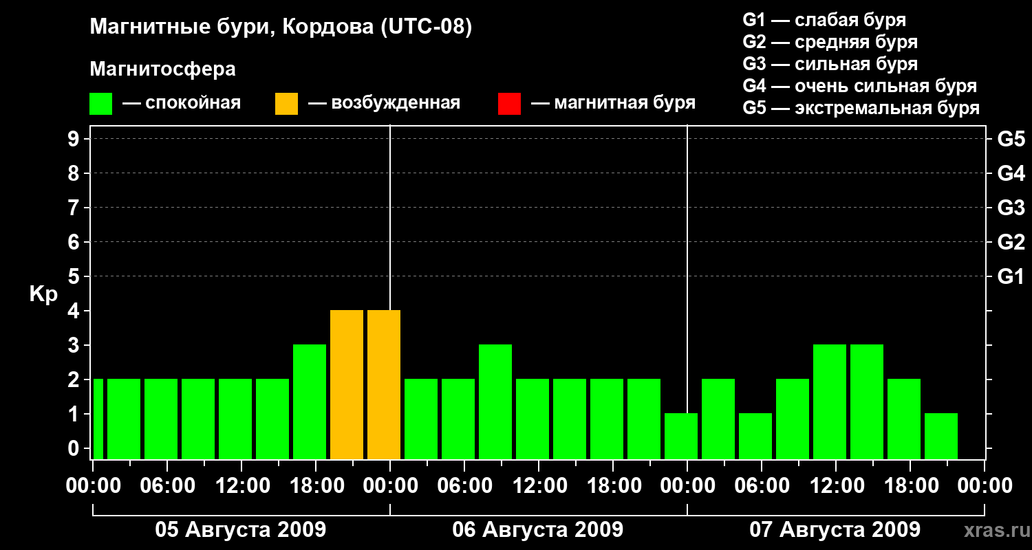 Изменения геомагнитного индекса Kp с 5 по 7 августа 2009 года для средних широт