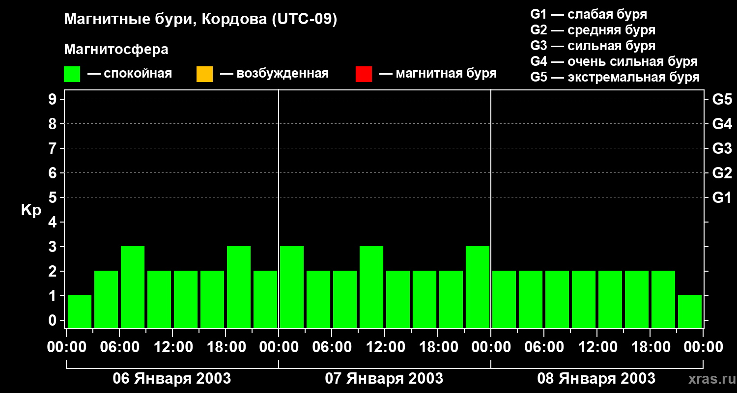 Изменения геомагнитного индекса Kp с 6 по 8 января 2003 года для средних широт