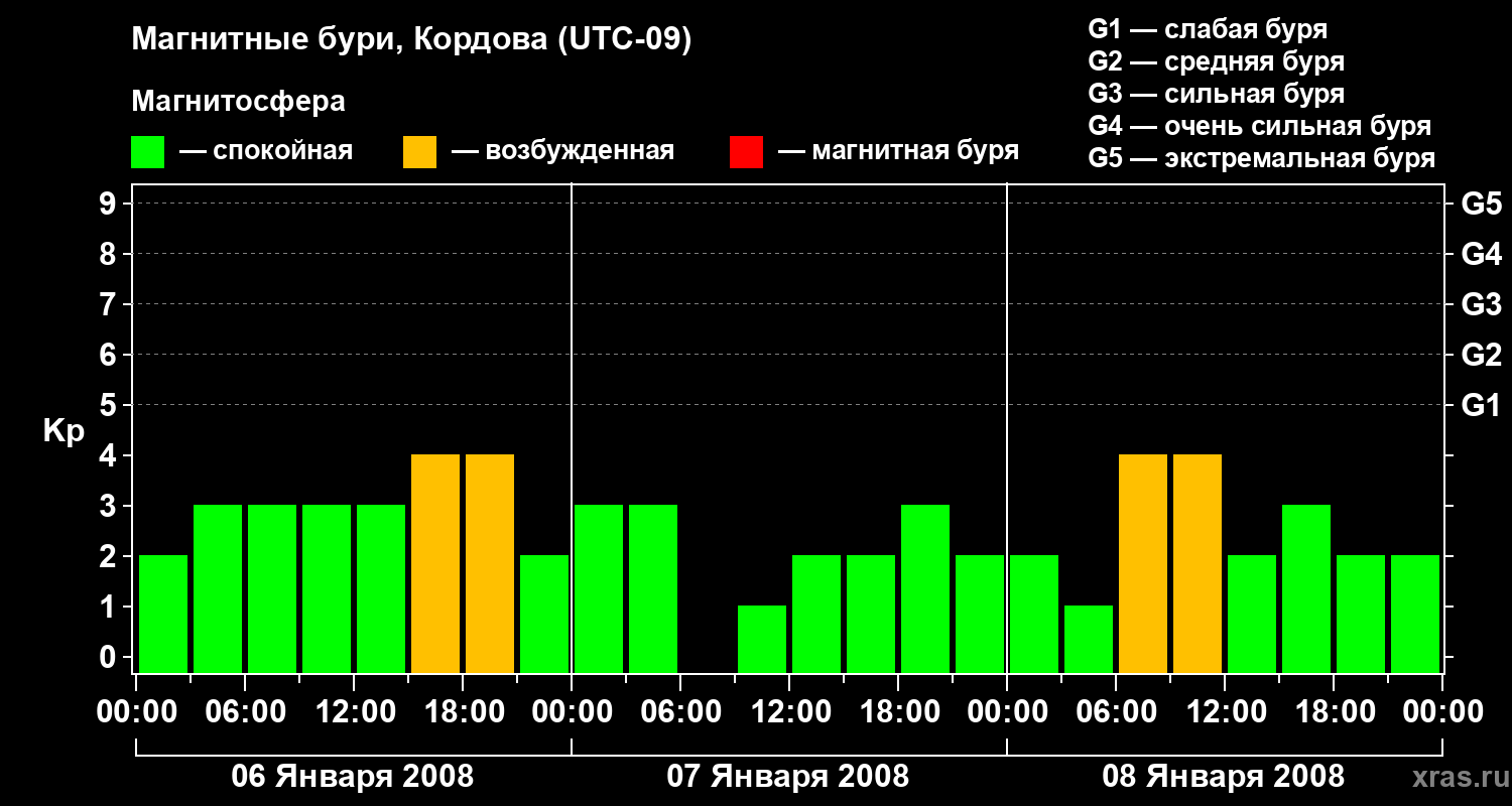 Изменения геомагнитного индекса Kp с 6 по 8 января 2008 года для средних широт