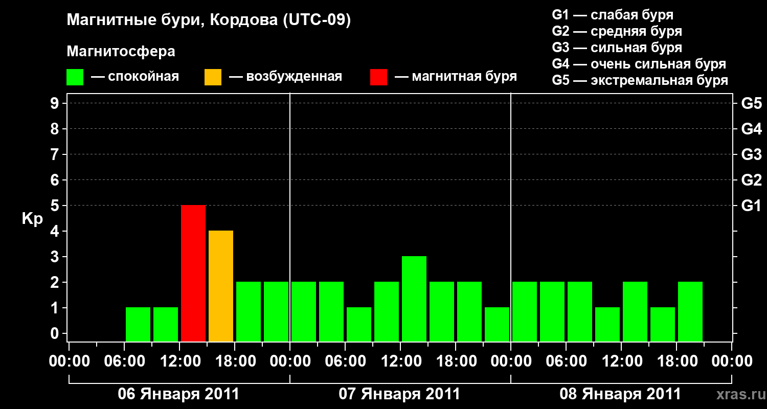 Изменения геомагнитного индекса Kp с 6 по 8 января 2011 года для средних широт