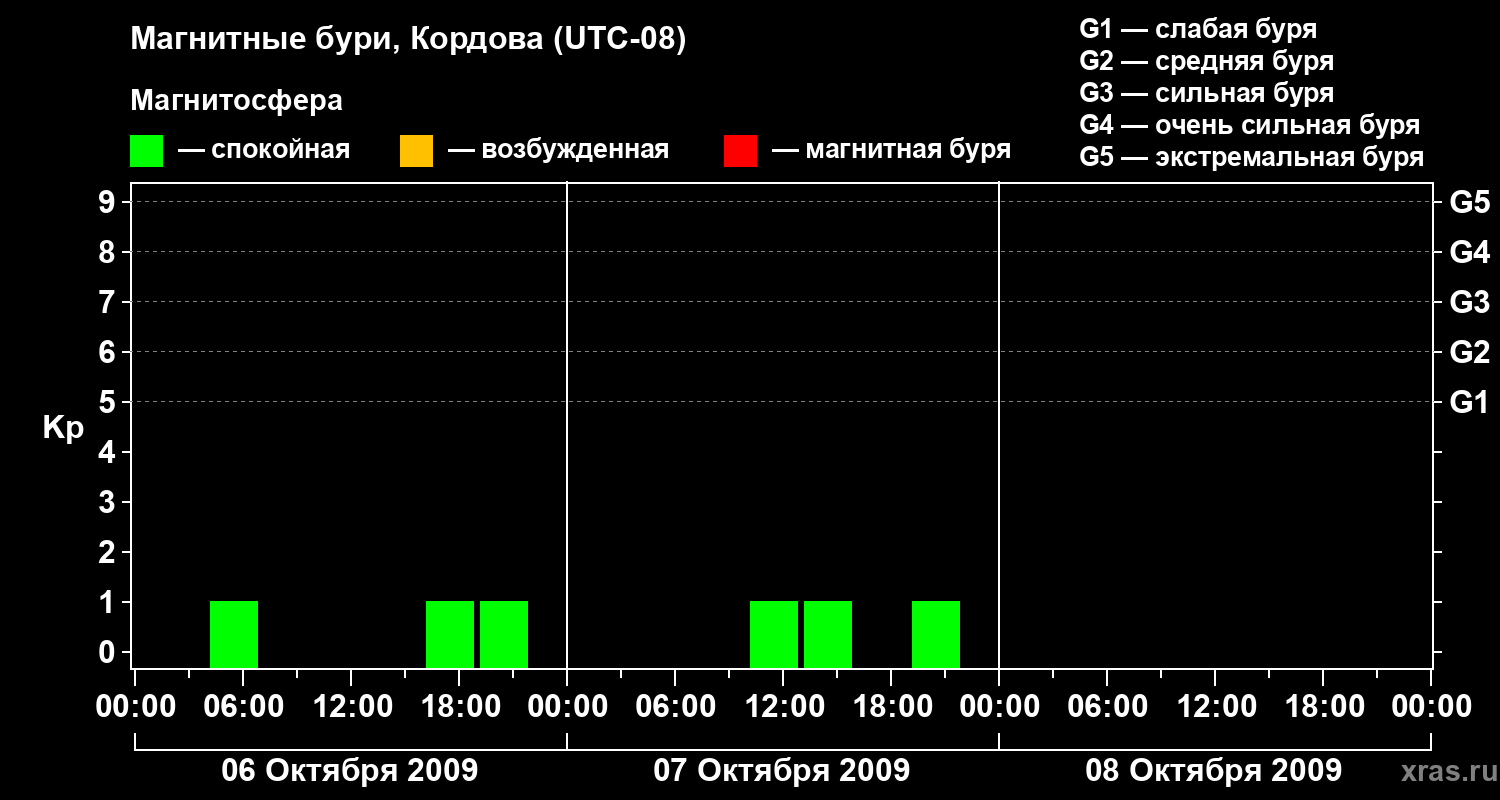 Изменения геомагнитного индекса Kp с 6 по 8 октября 2009 года для средних широт