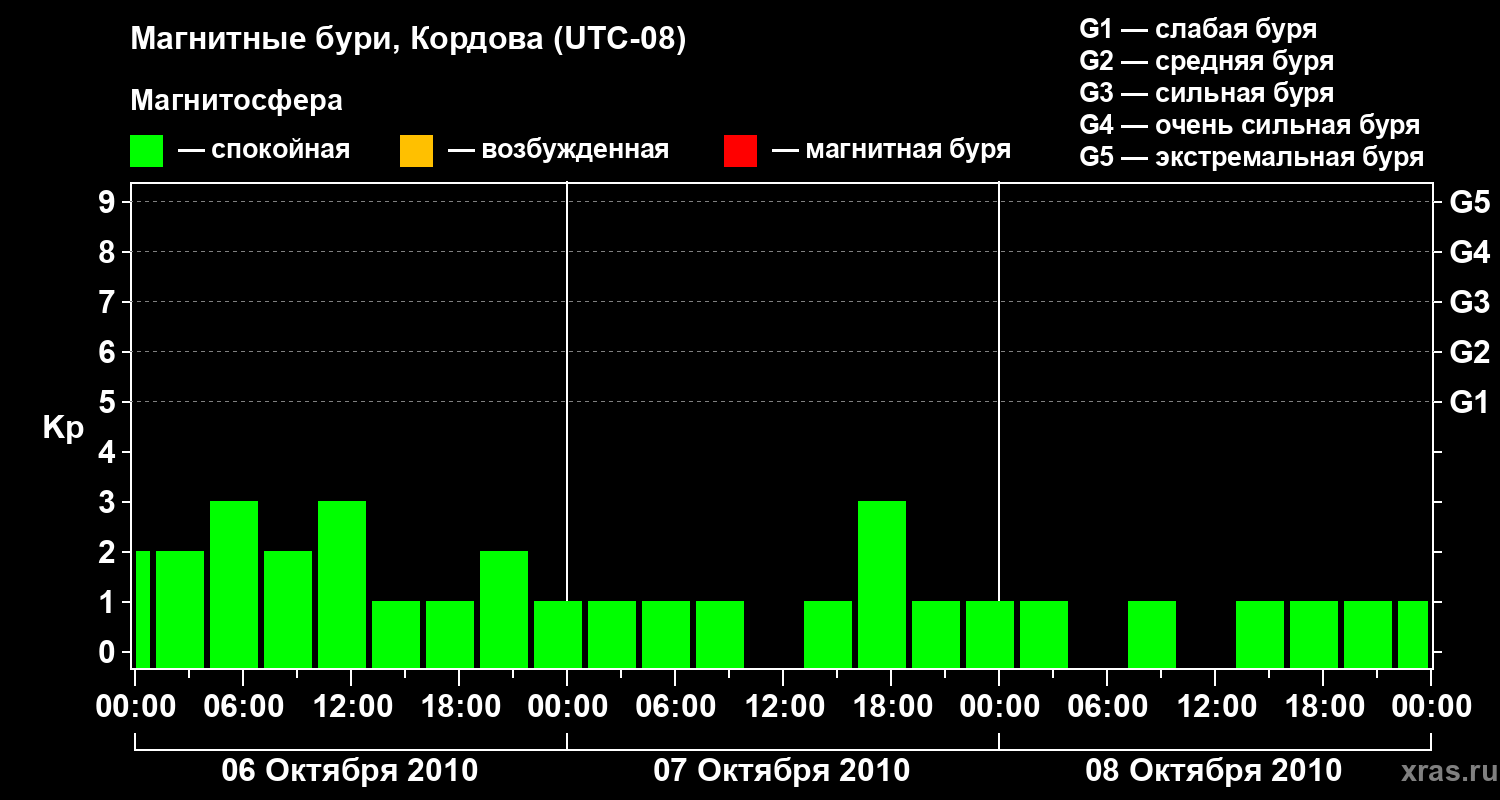 Изменения геомагнитного индекса Kp с 6 по 8 октября 2010 года для средних широт