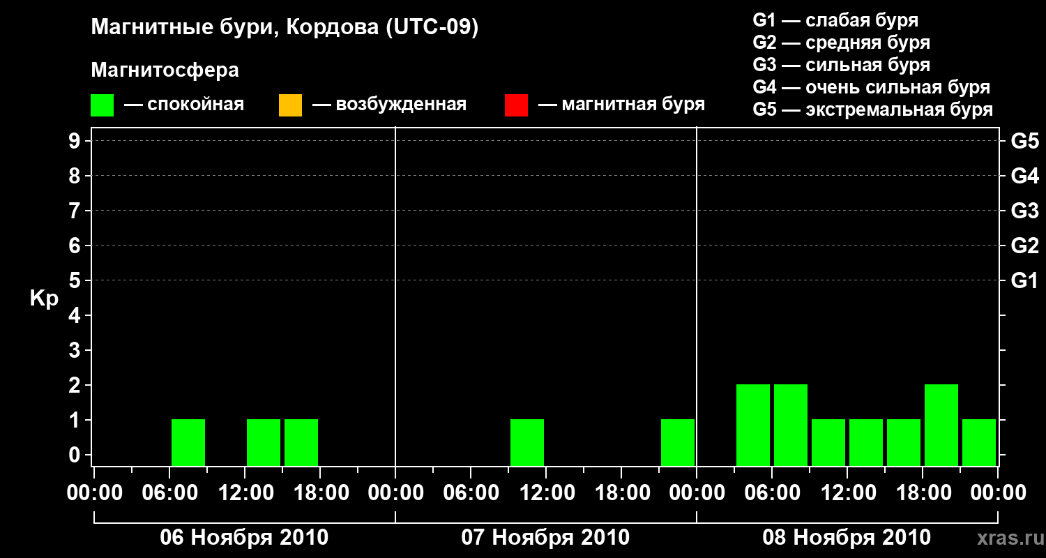 Изменения геомагнитного индекса Kp с 6 по 8 ноября 2010 года для средних широт