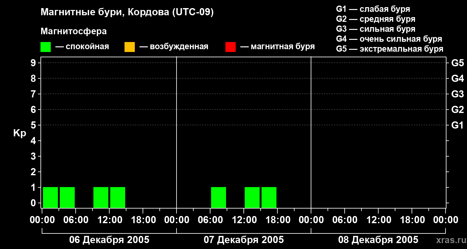 Изменения геомагнитного индекса Kp с 6 по 8 декабря 2005 года для средних широт