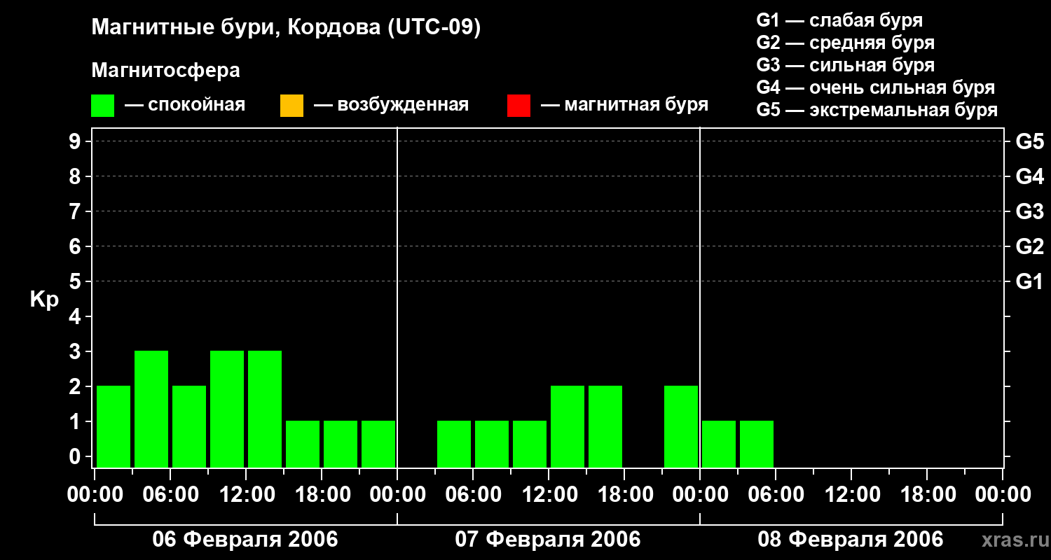 Изменения геомагнитного индекса Kp с 6 по 8 февраля 2006 года для средних широт