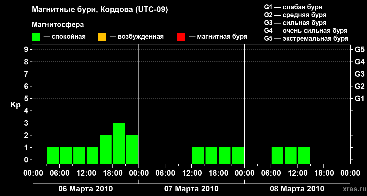 Изменения геомагнитного индекса Kp с 6 по 8 марта 2010 года для средних широт