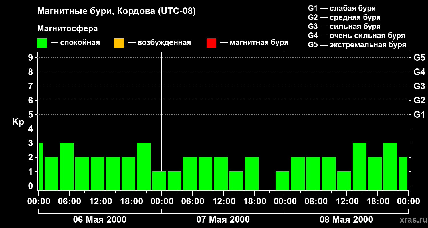 Изменения геомагнитного индекса Kp с 6 по 8 мая 2000 года для средних широт