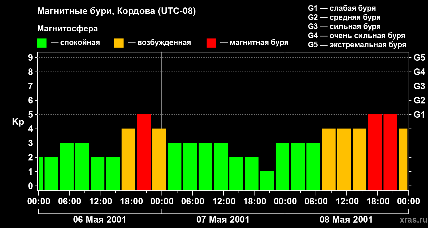Изменения геомагнитного индекса Kp с 6 по 8 мая 2001 года для средних широт