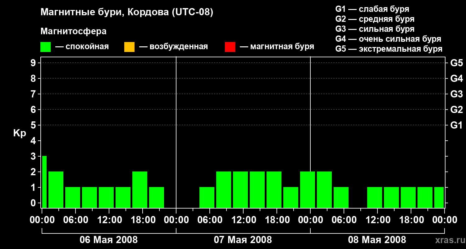 Изменения геомагнитного индекса Kp с 6 по 8 мая 2008 года для средних широт