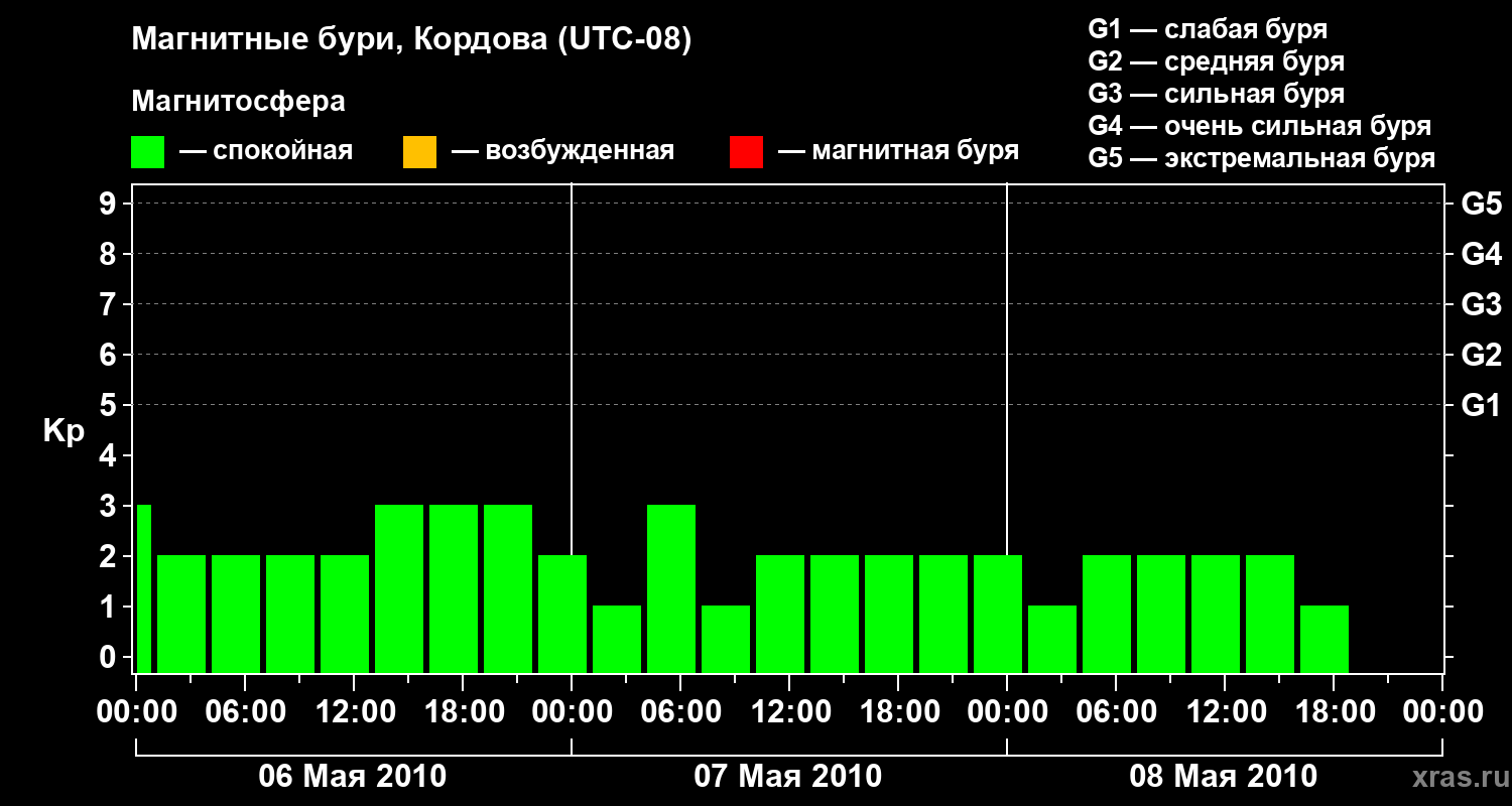 Изменения геомагнитного индекса Kp с 6 по 8 мая 2010 года для средних широт