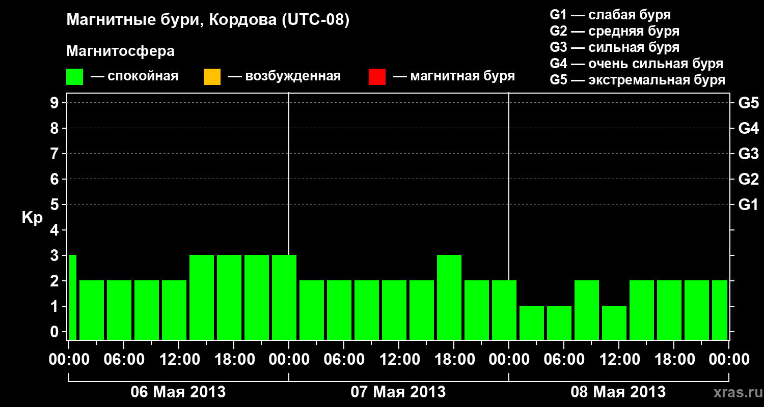 Изменения геомагнитного индекса Kp с 6 по 8 мая 2013 года для средних широт