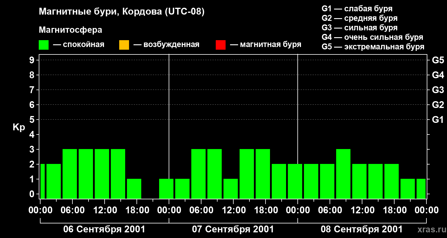 Изменения геомагнитного индекса Kp с 6 по 8 сентября 2001 года для средних широт