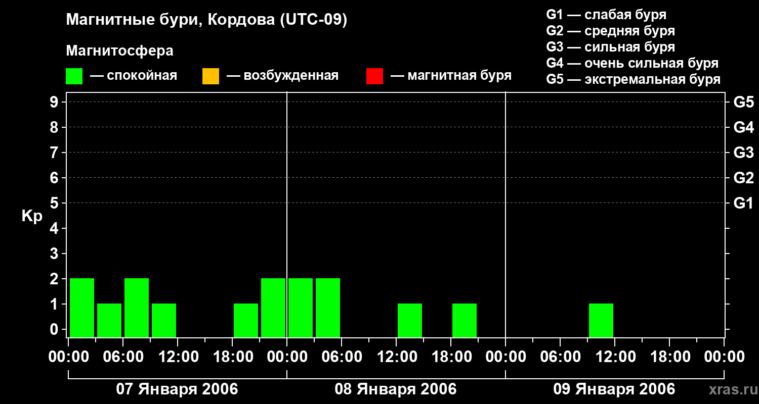 Изменения геомагнитного индекса Kp с 7 по 9 января 2006 года для средних широт