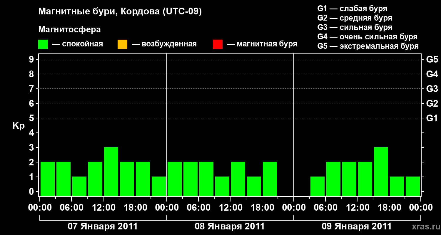 Изменения геомагнитного индекса Kp с 7 по 9 января 2011 года для средних широт
