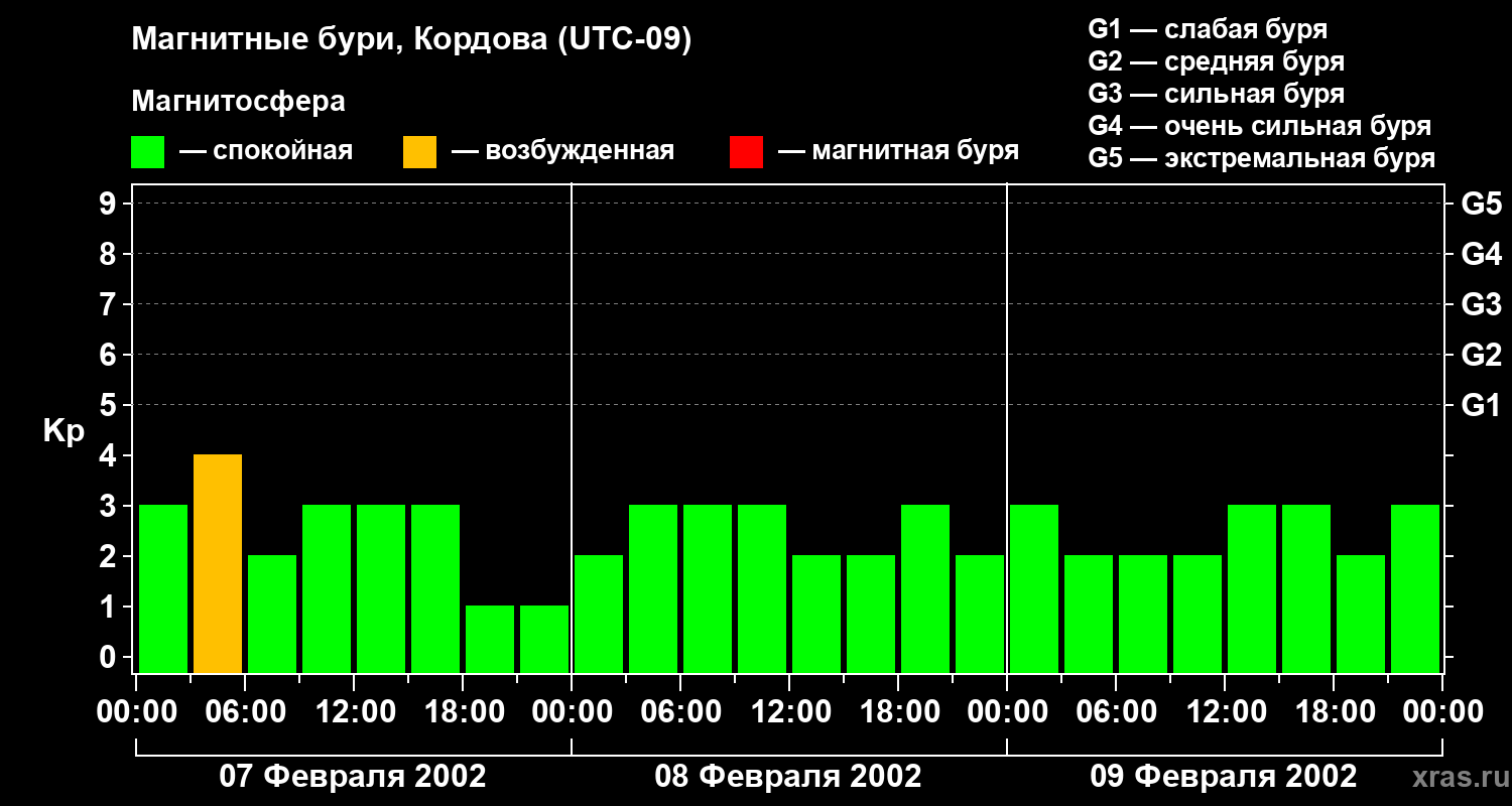 Изменения геомагнитного индекса Kp с 7 по 9 февраля 2002 года для средних широт