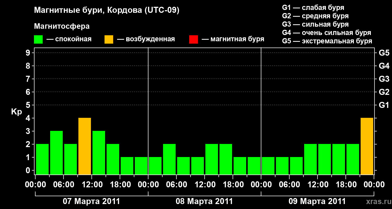 Изменения геомагнитного индекса Kp с 7 по 9 марта 2011 года для средних широт