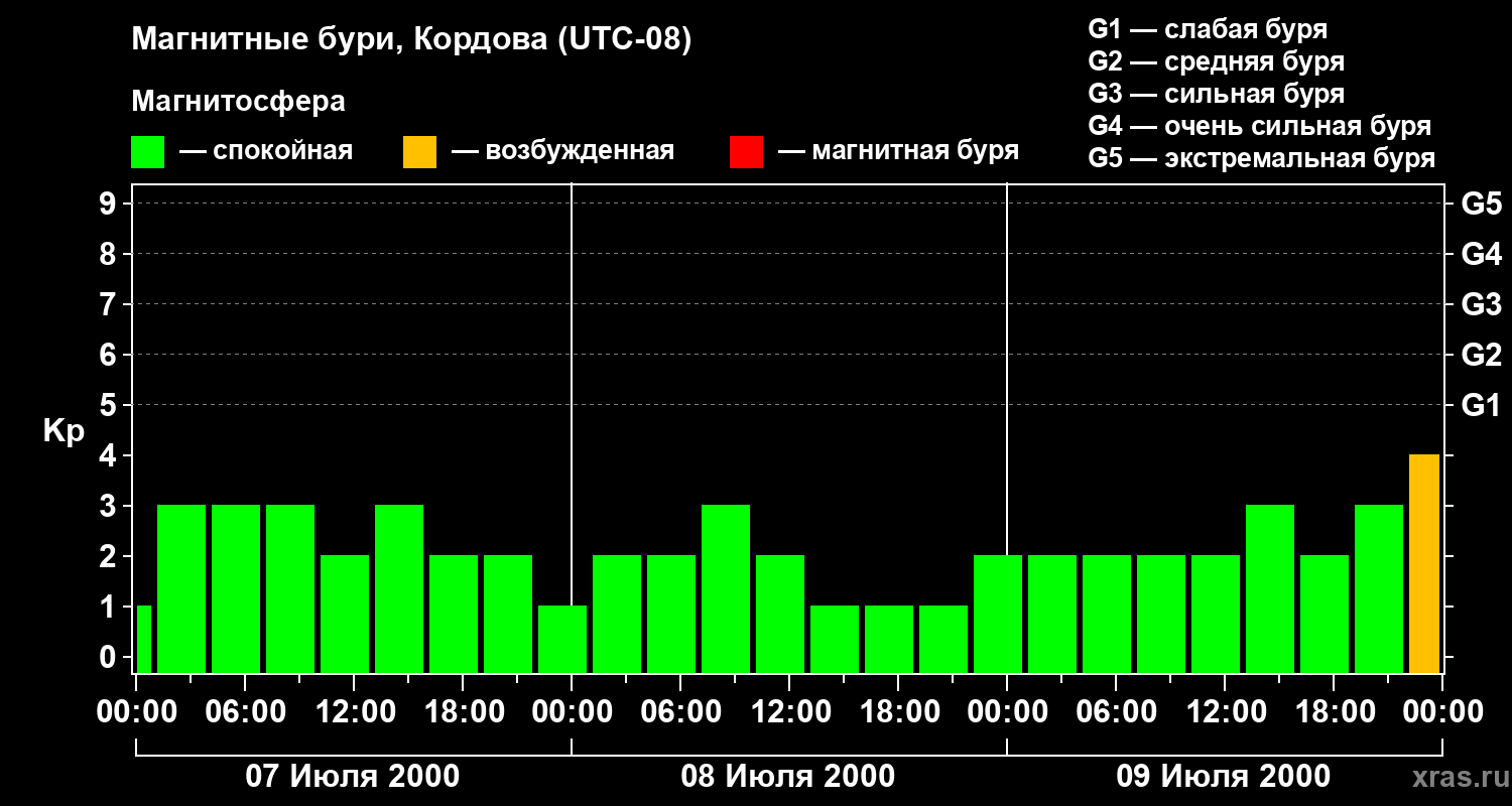Изменения геомагнитного индекса Kp с 7 по 9 июля 2000 года для средних широт